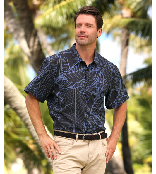 Island Crew Men's Stretch Short Sleeve Aloha Shirt: Banana Grove, Black