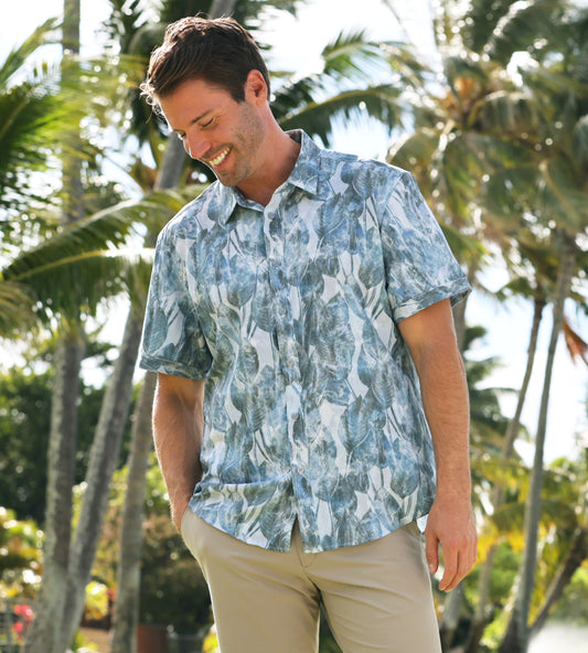 Island Crew Men's Stretch Short Sleeve Aloha Shirt: Leafy Lagoon