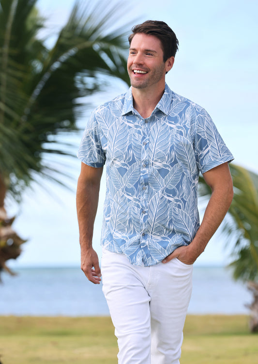 Island Crew Men's Stretch Short Sleeve Aloha Shirt: Manoa Jungle, Blue
